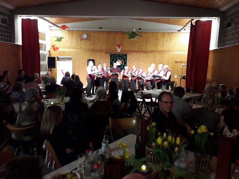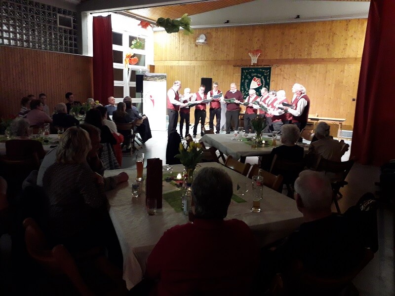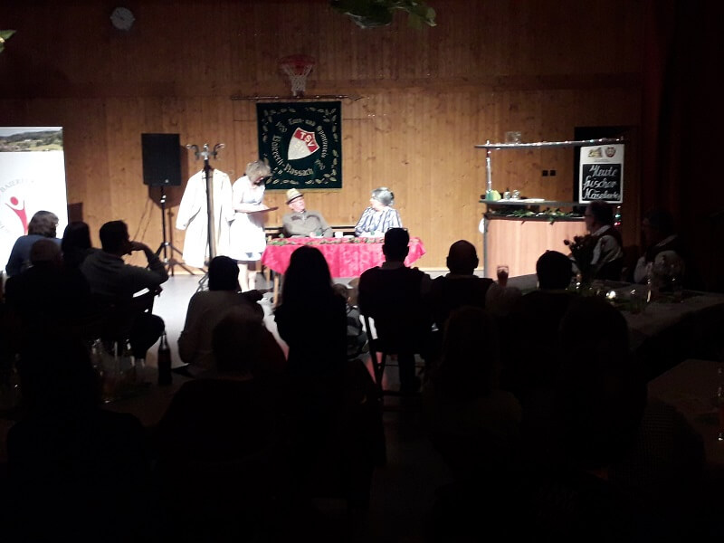 Im dritten Teil der Veranstaltung wurden die Gäste noch mit drei weiteren Titeln des Männerchors verwöhnt, das Jubi-Team gab einen nicht ganz ernst gemeinten Einblick in die Vorbereitung zum 100-Jahr-Jubiläum und ein älteres Ehepaar ließ die Zuschauer einen typischen Café-Besuch miterleben.
